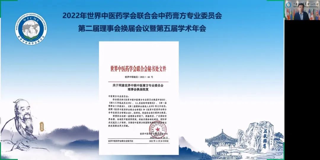世界中聯(lián)主席馬建中通過視頻方式致辭,向參加中醫(yī)膏方專業(yè)委員會(huì)第二屆理事會(huì)換屆會(huì)議的線上嘉賓表示歡迎。他講到,近年來,黨和國家高度重視中醫(yī)藥的發(fā)展,出臺(tái)了一系列支持政策,黨的二十大報(bào)告再次強(qiáng)調(diào)“促進(jìn)中醫(yī)藥創(chuàng)新傳承發(fā)展”,這些都為中醫(yī)藥事業(yè)發(fā)展提供了堅(jiān)強(qiáng)保障。世界中聯(lián)是全球最大的中醫(yī)藥國際學(xué)術(shù)組織,在中醫(yī)藥深入?yún)⑴c全球治理中持續(xù)發(fā)揮著重要作用。在中醫(yī)藥深入?yún)⑴c全球治理中持續(xù)發(fā)揮著重要作用。膏方是中醫(yī)養(yǎng)生文化的精髓,在進(jìn)補(bǔ)方面有深厚的臨床經(jīng)驗(yàn),膏方即可治療慢性疾病又可滋補(bǔ)大病過后的虛弱病體,是兼顧治療和補(bǔ)虛雙重作用的良劑。中醫(yī)膏方專業(yè)委員會(huì)在董瑞會(huì)長帶領(lǐng)下,在組織學(xué)術(shù)會(huì)議和開展國際交流、抗擊疫情、科研創(chuàng)新、醫(yī)療幫扶等方面做了大量工作,促進(jìn)了中醫(yī)膏方走向世界,關(guān)注民間中醫(yī)藥瑰寶的挖掘整理,通過政協(xié)提案促進(jìn)民間膏方傳承及其制作工藝的搶救,為保護(hù)民間膏方獻(xiàn)技出力,開展科研課題與臨床實(shí)踐提高藥方、膏方的臨床療效,踐行“療效是中醫(yī)藥生命線”的真理,發(fā)出倡議鼓勵(lì)理事們積極投入抗疫,第一屆理事會(huì)工作取得了突出成績,榮獲了世界中聯(lián)頒發(fā)的“抗擊疫情榮譽(yù)集體”稱號(hào)和2020-2021年度先進(jìn)分支機(jī)構(gòu)三等獎(jiǎng)。希望新一屆理事會(huì)在董瑞會(huì)長領(lǐng)導(dǎo)下,能夠充分發(fā)揮世界中聯(lián)平臺(tái)優(yōu)勢(shì),繼續(xù)辦好“一帶一路”雁棲湖中醫(yī)膏方國際高峰論壇,加快膏方相關(guān)標(biāo)準(zhǔn)起草,促進(jìn)膏方產(chǎn)品和市場(chǎng)開發(fā),加強(qiáng)國際交流交往,助力中醫(yī)藥走向世界。