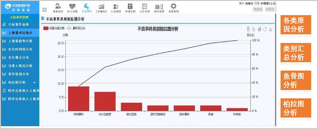 支持14項目+時間+科室+個人+患者 超精細(xì)化統(tǒng)計分析,自動抽取 跌倒評估、墜床評估等護(hù)理文書數(shù)據(jù),進(jìn)行二次機構(gòu)化統(tǒng)計分析,極大降低工作量。