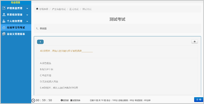 針對醫(yī)院等級評審和日常護(hù)理管理需要,護(hù)理在線學(xué)習(xí)與考試系統(tǒng),可以方便地完成全程在線學(xué)習(xí)、考試、統(tǒng)計以及持續(xù)跟蹤,試題設(shè)置、一鍵下發(fā),在線學(xué)習(xí)、省心省力。
