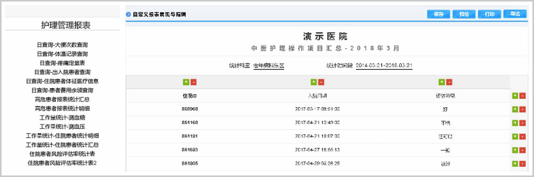 系統(tǒng)內(nèi)置具有高度可配置性的自定義報表功能,不僅支持查詢分析類報表更加可以實現(xiàn)基于報表的二次錄入和實時編輯,充分滿足護(hù)理統(tǒng)計預(yù)分析的個性化需求