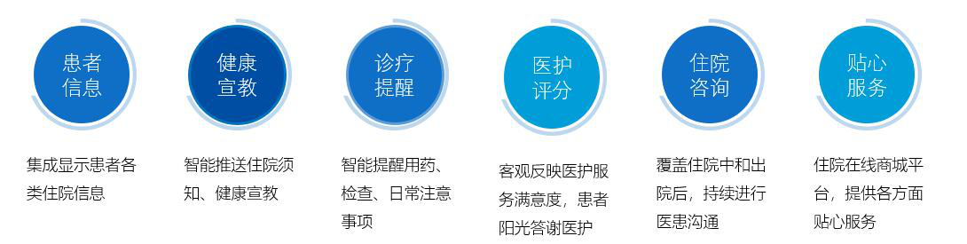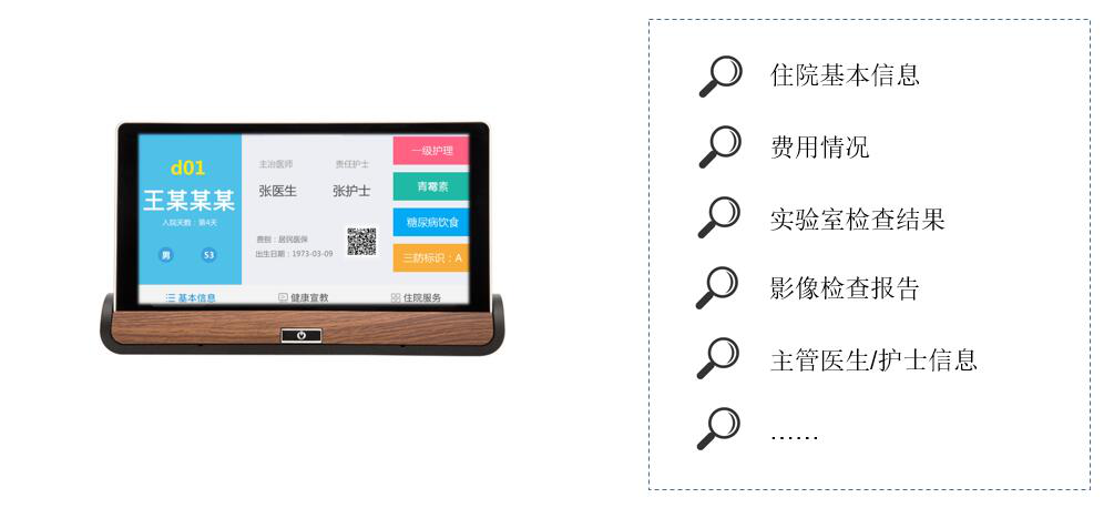 拓展床旁醫(yī)護、營養(yǎng)點餐、患者貼心服務、醫(yī)患交流、住院宣教、健康指導等功能,改善住院服務流程,改善患者就醫(yī)體驗,優(yōu)化醫(yī)患交互,改善醫(yī)療服務模式,提升智慧醫(yī)療的效率和水平。