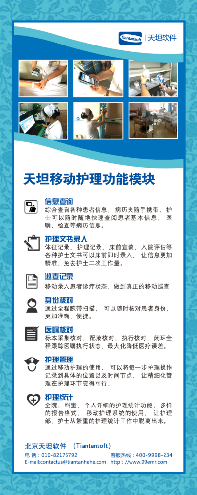 天坦移動(dòng)護(hù)理系統(tǒng)提供全面的護(hù)理服務(wù)。系統(tǒng)以整體護(hù)理為核心,將各類移動(dòng)終端與護(hù)理業(yè)務(wù)流程相結(jié)合,護(hù)士利用系統(tǒng)內(nèi)完善的護(hù)理計(jì)劃、護(hù)理評(píng)估、健康教育等功能為病人提供更全面的服務(wù)。