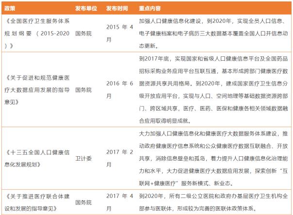 事實(shí)上,自2015年4月,國(guó)務(wù)院發(fā)布《全國(guó)醫(yī)療衛(wèi)生服務(wù)體系規(guī)劃綱要(2015-2020)》,提出加強(qiáng)人口健康信息化建設(shè),到2020年,實(shí)現(xiàn)全員人口信息、電子健康檔案和電子病歷三大數(shù)據(jù)基本覆蓋全國(guó)人口并信息動(dòng)態(tài)更新,我國(guó)陸續(xù)出臺(tái)了一系列加速醫(yī)療信息化產(chǎn)業(yè)發(fā)展的政策。